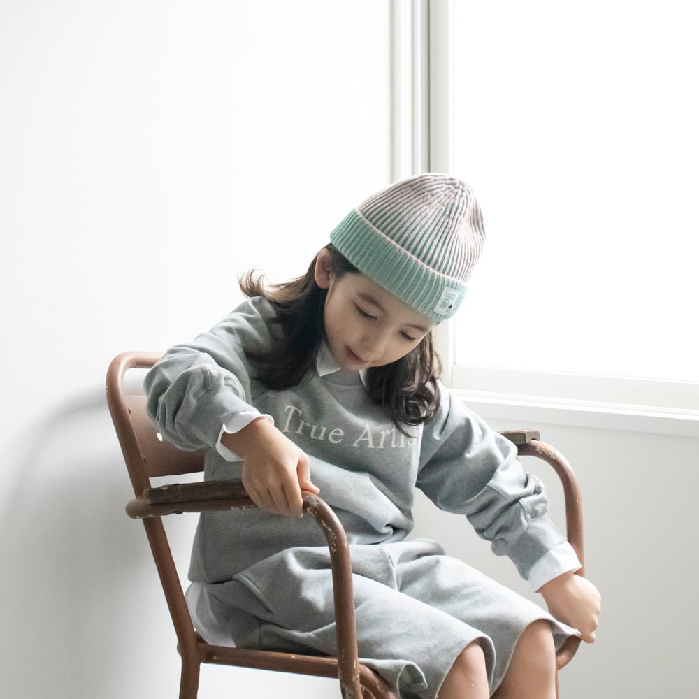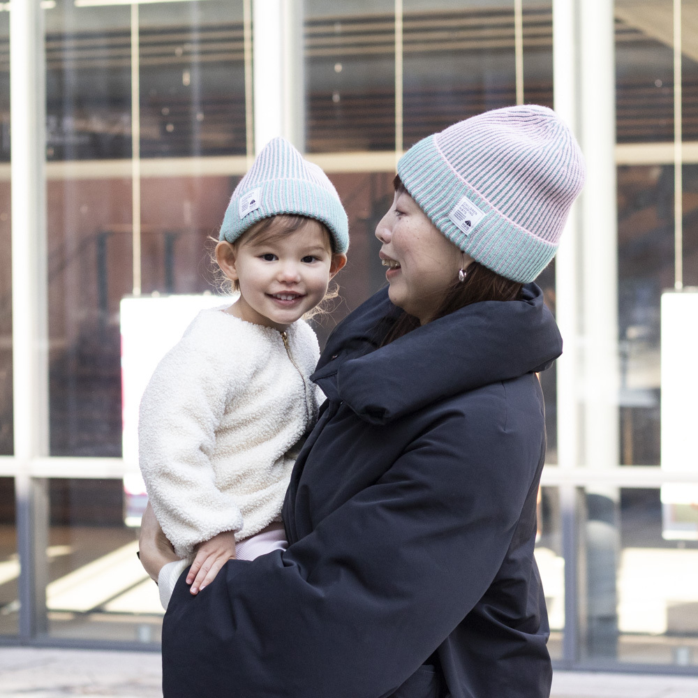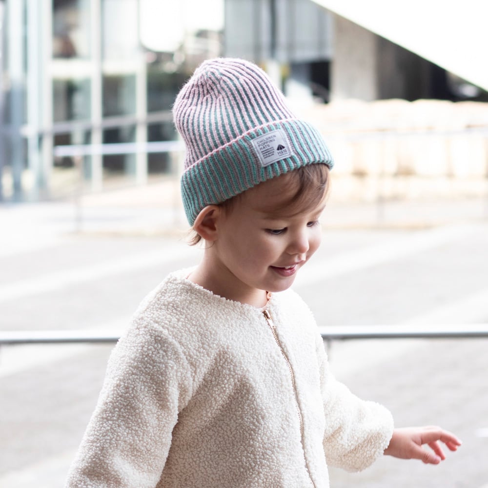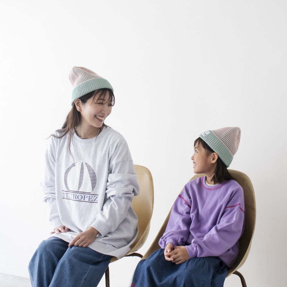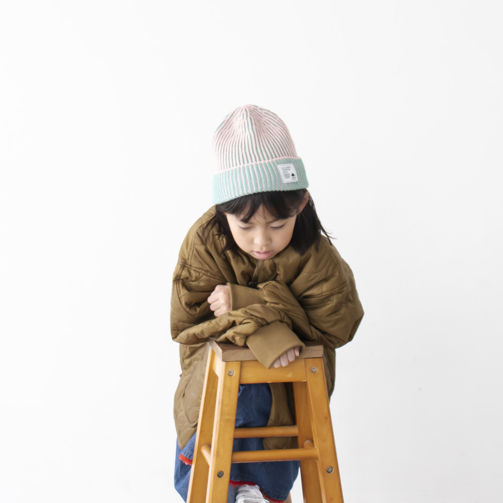 ミントグリーンとピンクでストライプのデザインで、本体とリブ部分のツートーンのような配色もこのニットキャップ の特徴。